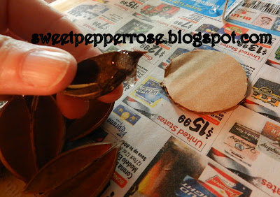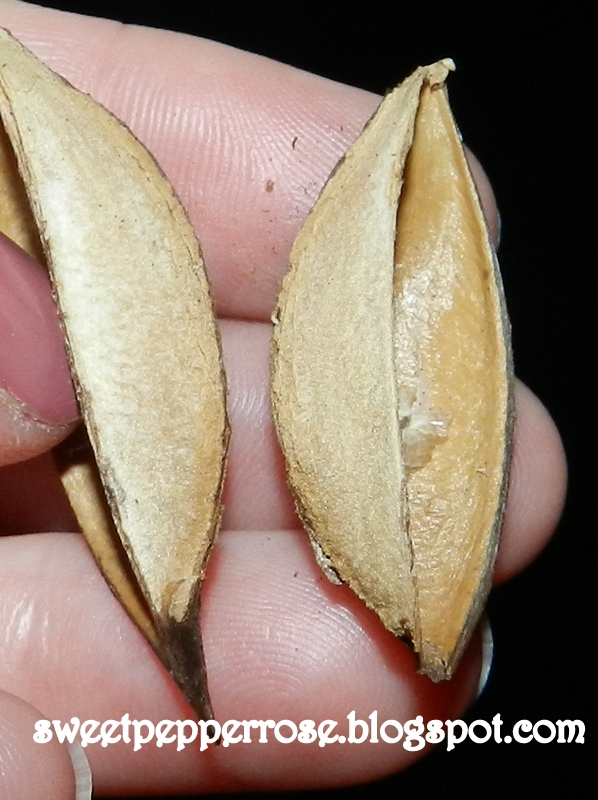 open halfway when they dry out, making it very easy to finish the separation. There is also a small center “star” when pulled apart correctly.(the "claw-foot" at the left end:) I refer to the halves as doubles, and these can also be separated into singles, which is what I made the stars with on my July 4th Acorn & Seed Pod Wreath. One end of the seed pods will have two points, the other only one.